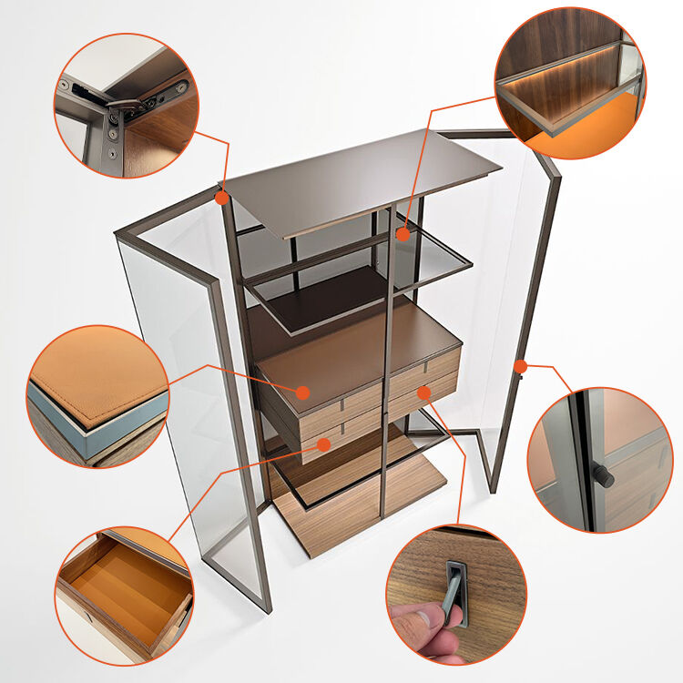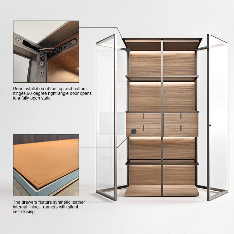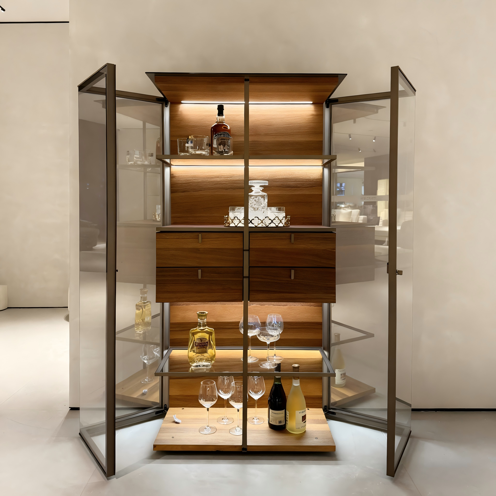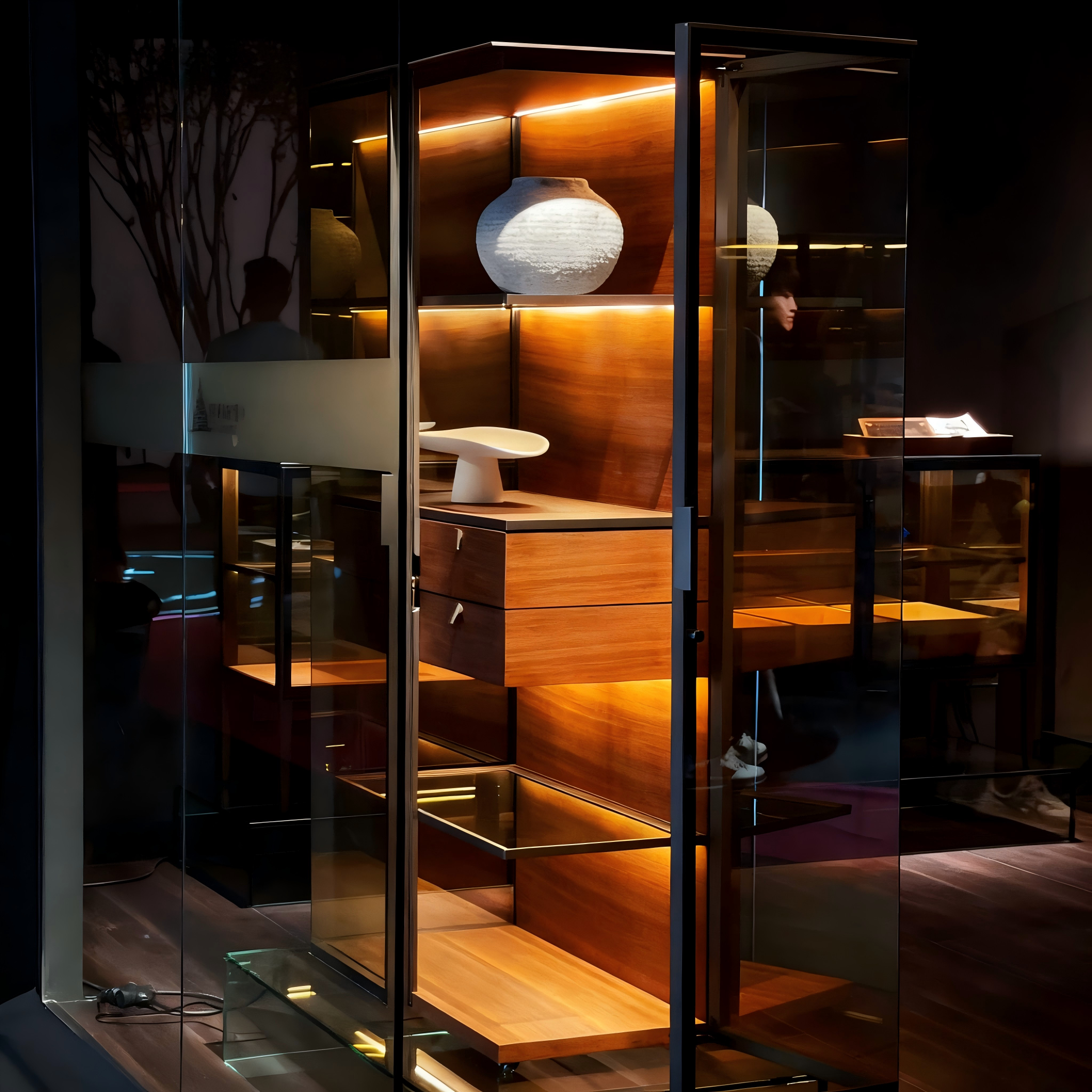ESM Aircraft appears as a precious transparent glass cabinet with an original opening system. It is a cabinet with rigorous proportions, which concentrates a series of exclusive technical solutions. These include the special opening of the doors which, with a thin aluminium structure and a special glass assembly technique, exclude the presence of lateral flanks and give the container an extraordinary light and transparent