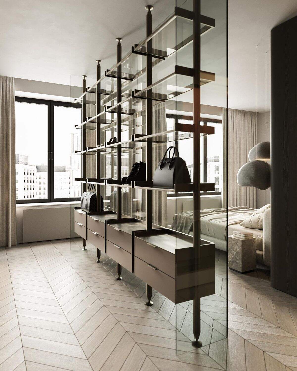 Made with natural wood tones and a fully customizable modular design, this shelving unit provides versatile storage and display options. It can be tailored to client needs from columns to drawers, allowing for personalized configurations. The mix of open shelves and closed drawers allows for tidy placement of decor, books, or daily items. Its light, airy structure brings a warm, welcoming vibe to any room, ideal for modern living or office areas