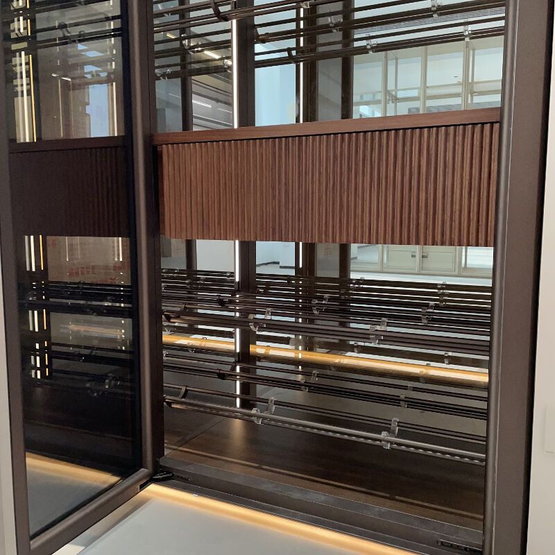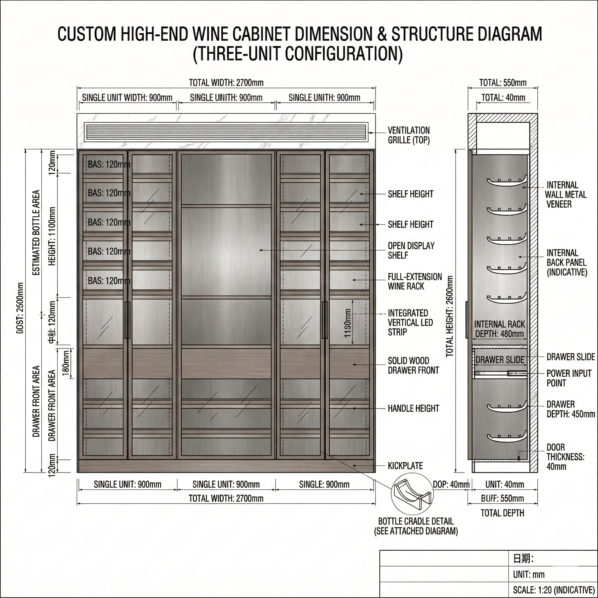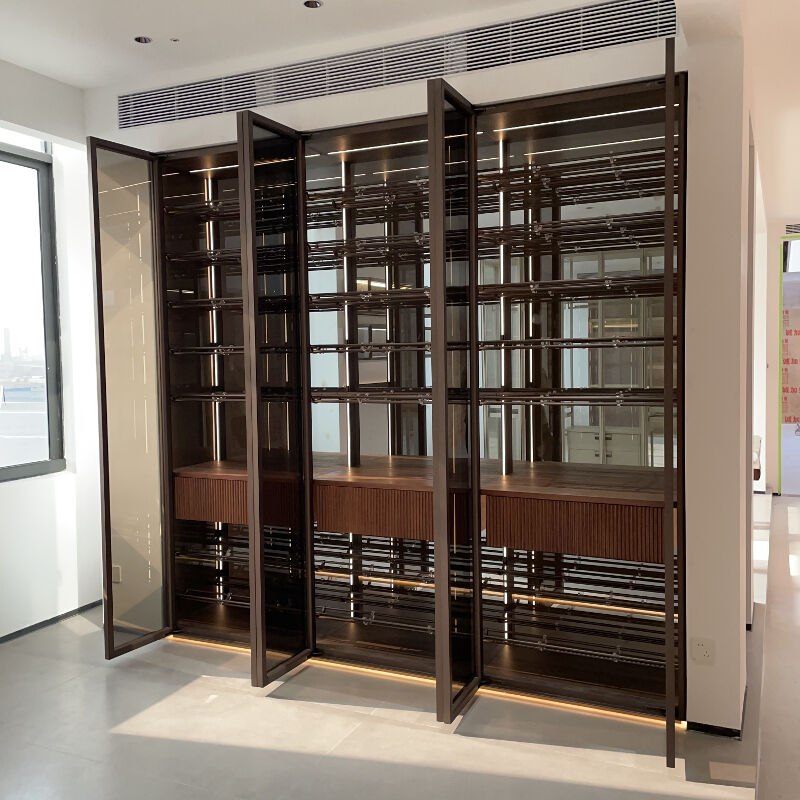 इस वाइन कैबिनेट में धातु फ्रेमवर्क, ग्लास पैनल और लकड़ी के आभूषणों के साथ एक परिष्कृत डिज़ाइन है। इसमें पूरी तरह से कस्टमाइज़ेबल मॉड्यूलर संरचना है, जो ग्राहक की आवश्यकताओं के अनुसार वाइन रैक से लेकर स्टोरेज इकाइयों तक के विशिष्ट विन्यास की अनुमति देती है। बहु-कार्यात्मक आंतरिक लेआउट वाइन संग्रह को व्यवस्थित करने और प्रदर्शित करने के लिए आदर्श है, जबकि ग्लास दरवाजे धूल-रोधी सुरक्षा और शानदार प्रदर्शन सुनिश्चित करते हैं। यह लक्ज़री रहने के स्थानों, वाइन सेलर या मनोरंजन क्षेत्रों में बिना किसी रुकावट के एकीकृत हो जाता है, जो कार्यक्षमता को उच्च-स्तरीय सौंदर्यशास्त्र के साथ मिलाता है।