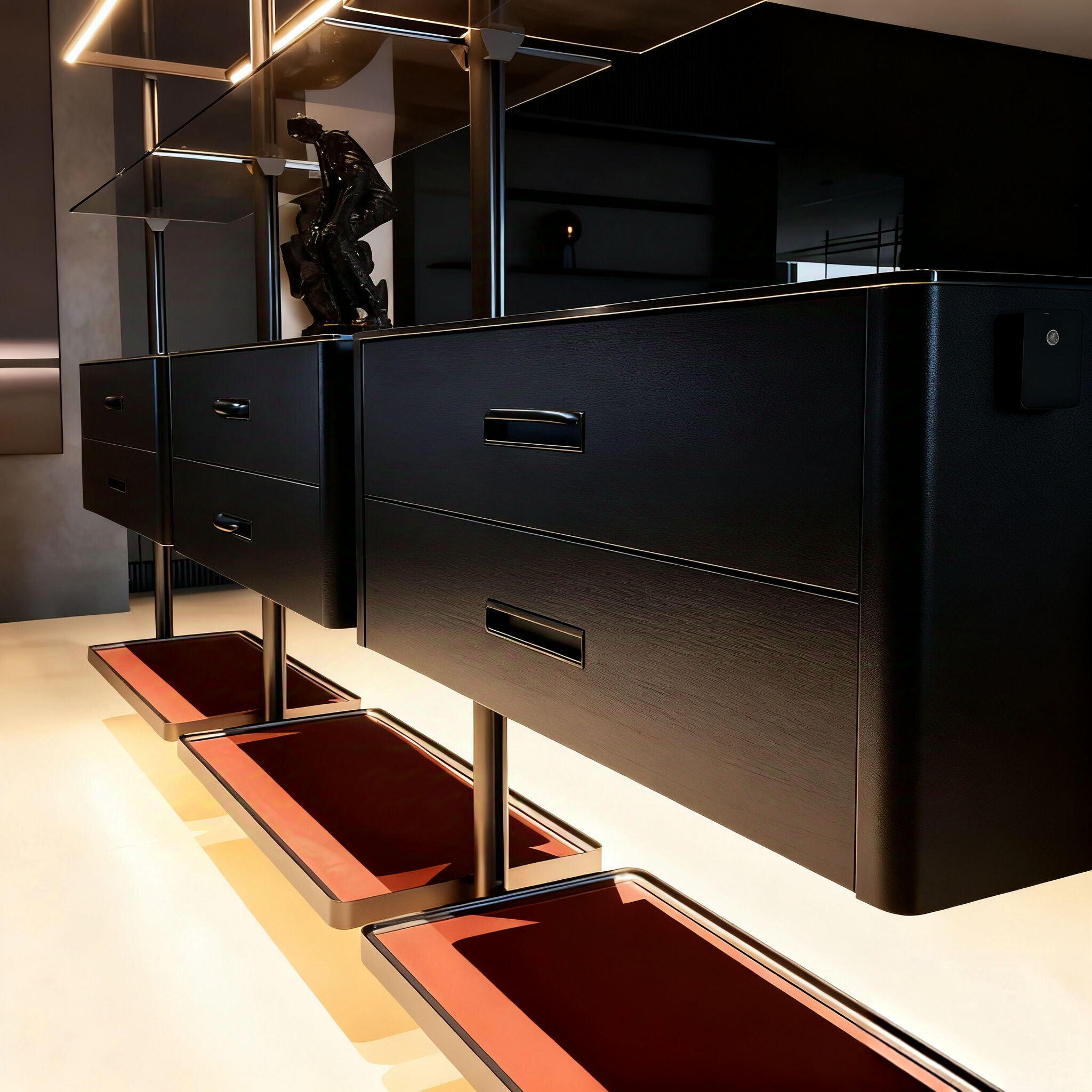 Crafted with premium aluminum frames and glass panels, this shelving unit features a fully customizable modular design. It can be tailored to client needs from columns to storage components, allowing for personalized configurations. Equipped with integrated lighting, it elegantly displays decor, books, or art pieces while offering tidy storage with closed drawers. Its sleek, industrial-chic structure adds a sophisticated touch to modern living spaces, offices, or showrooms.