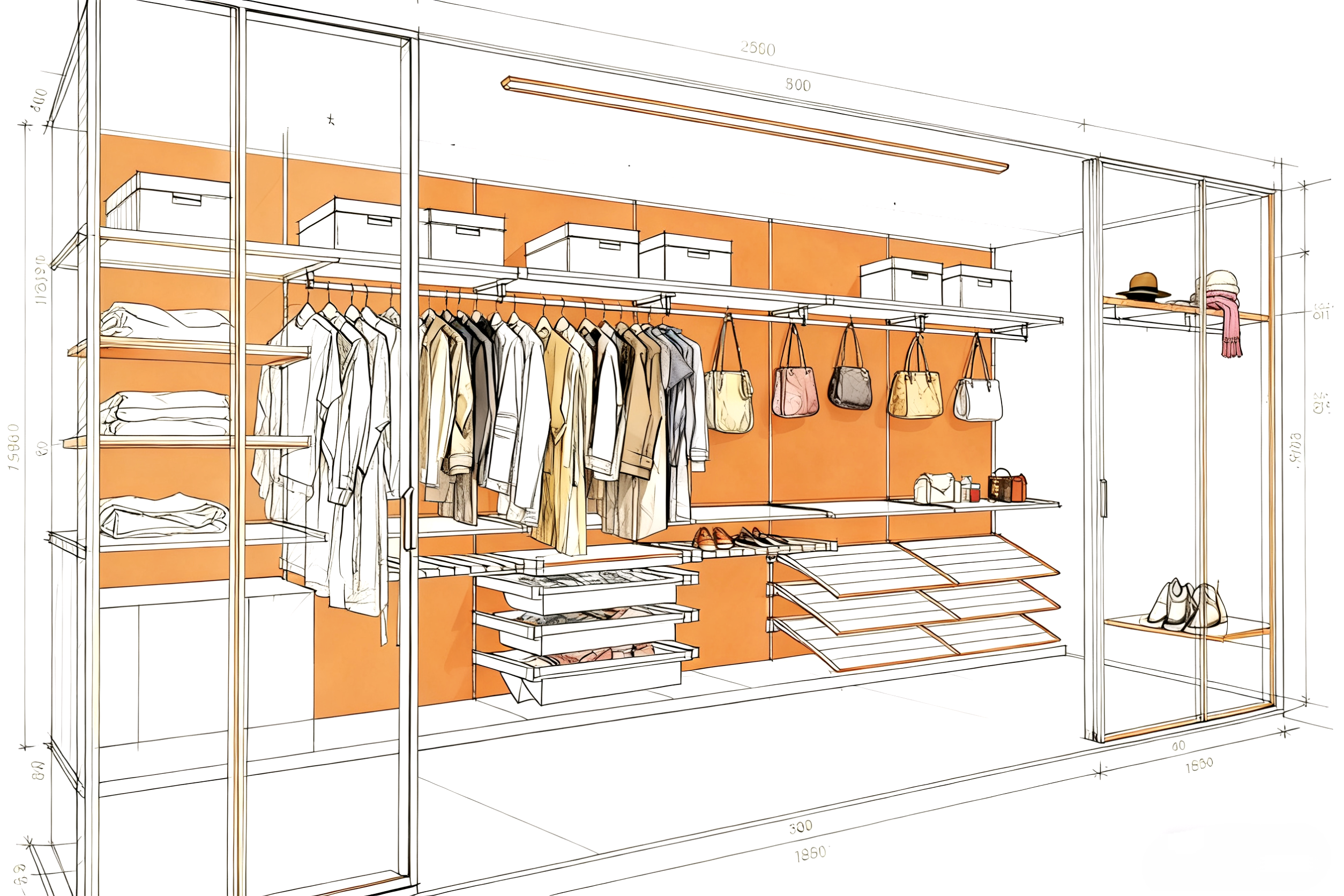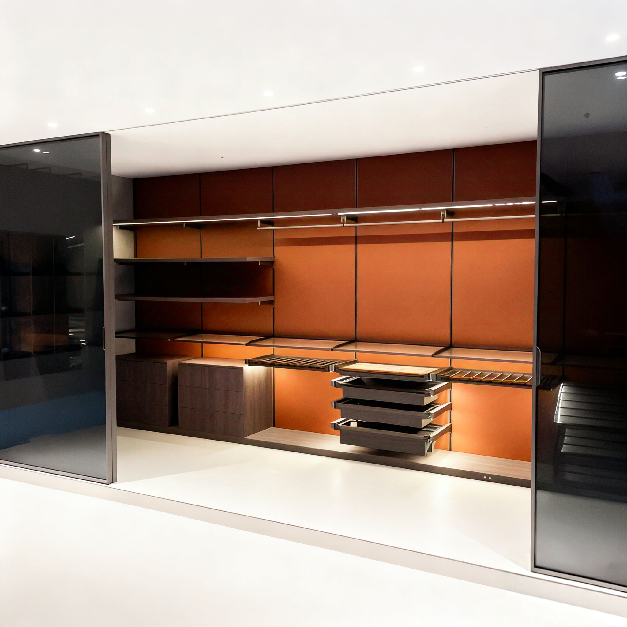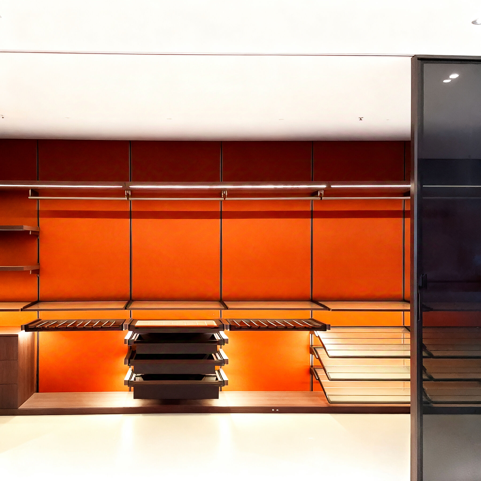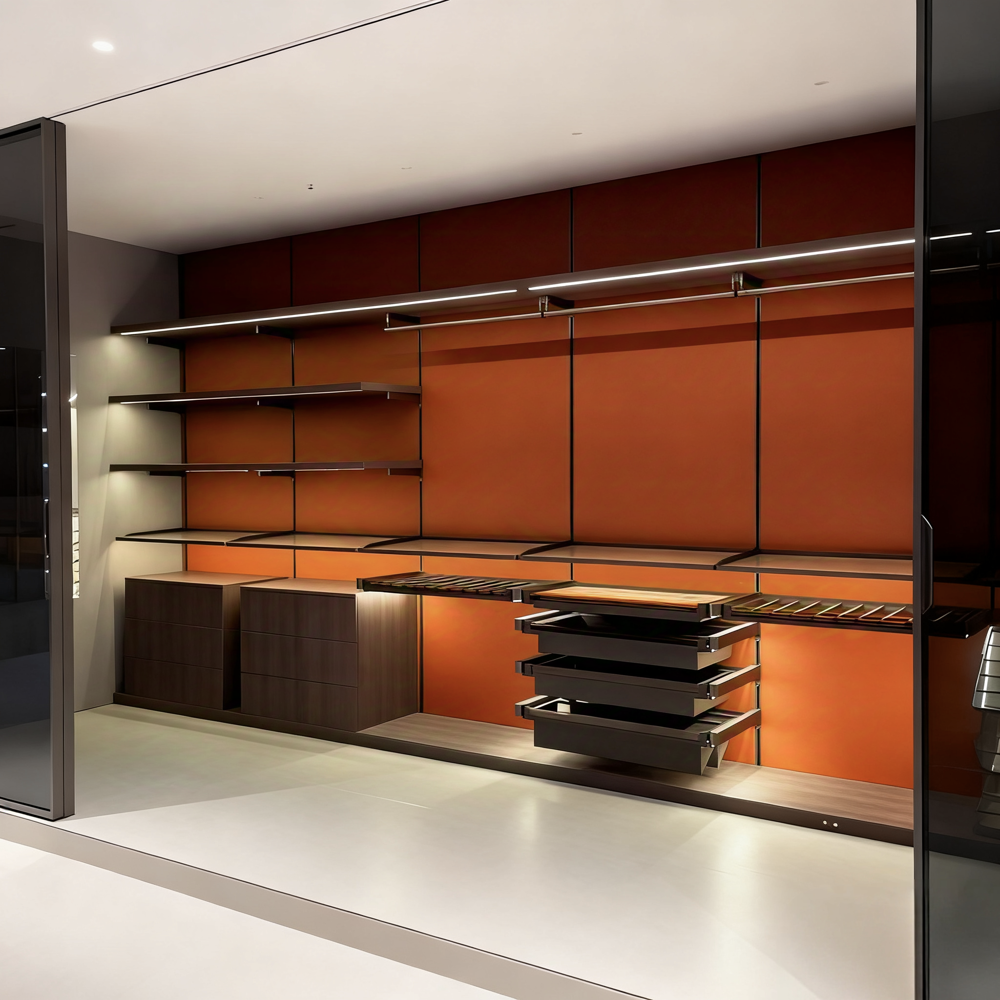 This luxury walk-in closet boasts a refined design with metal frameworks, glass panels, and premium finishes. It comes with a fully customizable modular structure, enabling personalized configurations of hanging zones, shelves, drawers, and specialty storage (such as shoe racks and accessory trays) based on client demands. Integrated lighting enhances the display of clothing and accessories, while the glass elements add a sleek, modern touch. The harmonious color palette and multi-functional layout make it a standout feature in upscale bedrooms, perfectly balancing organizational practicality and high-end aesthetic appeal.