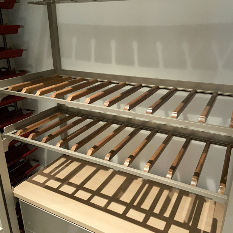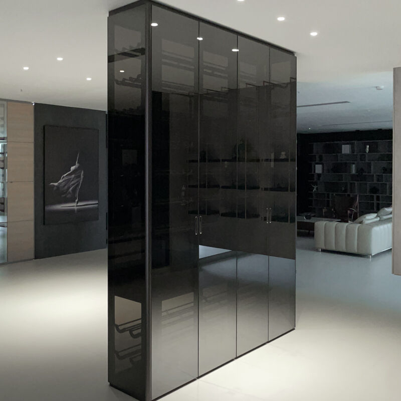 Crafted with high-gloss black glass and sleek metal frames, this wine cabinet boasts a modern and minimalist design. It offers customizable configurations to fit different spatial needs, with flexible internal wine racks and storage compartments. The reflective glass surface adds a touch of luxury, while the enclosed structure ensures optimal protection for wine collections. It serves as a statement piece in modern interiors, elevating the style of living rooms, dining areas, or dedicated wine spaces.