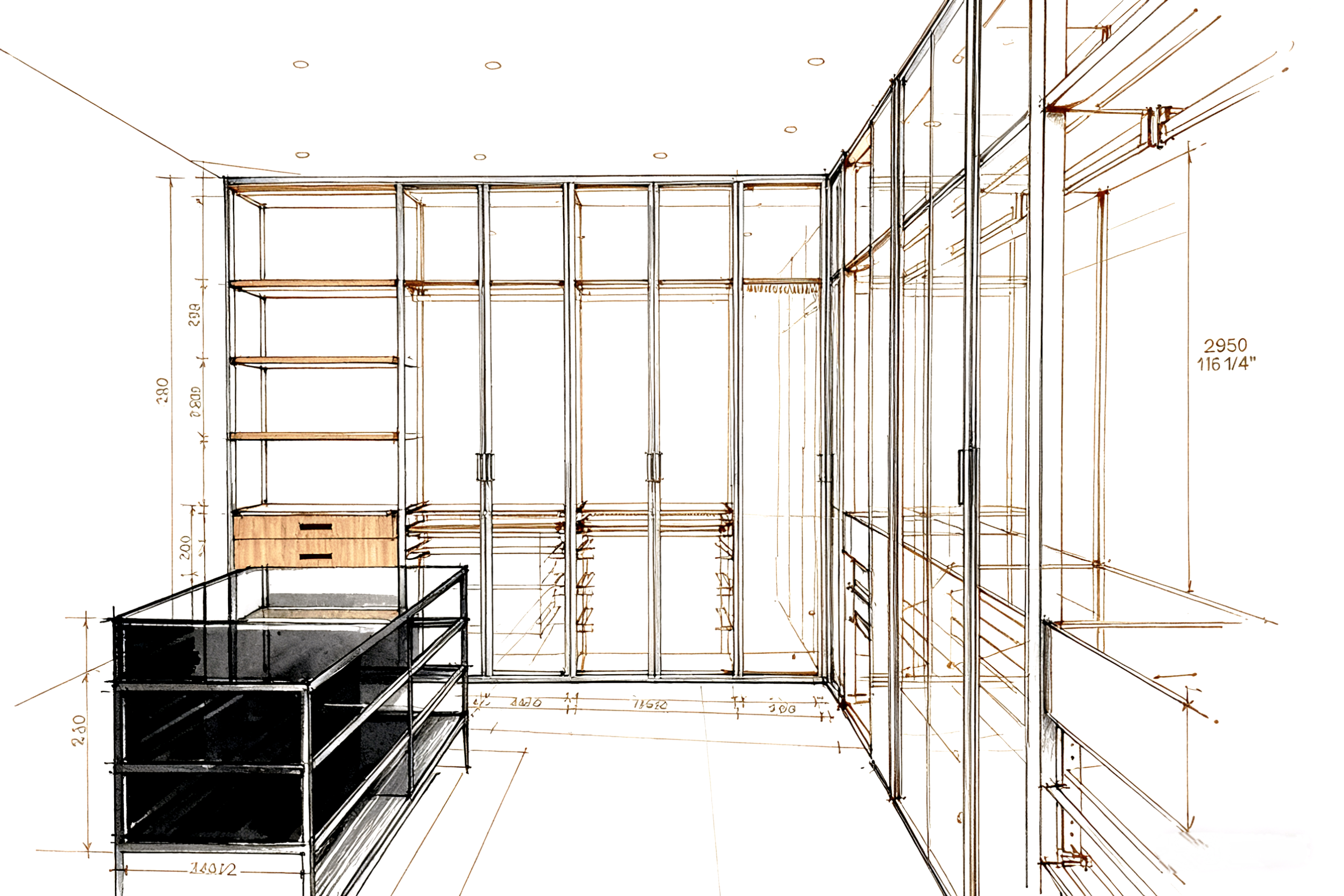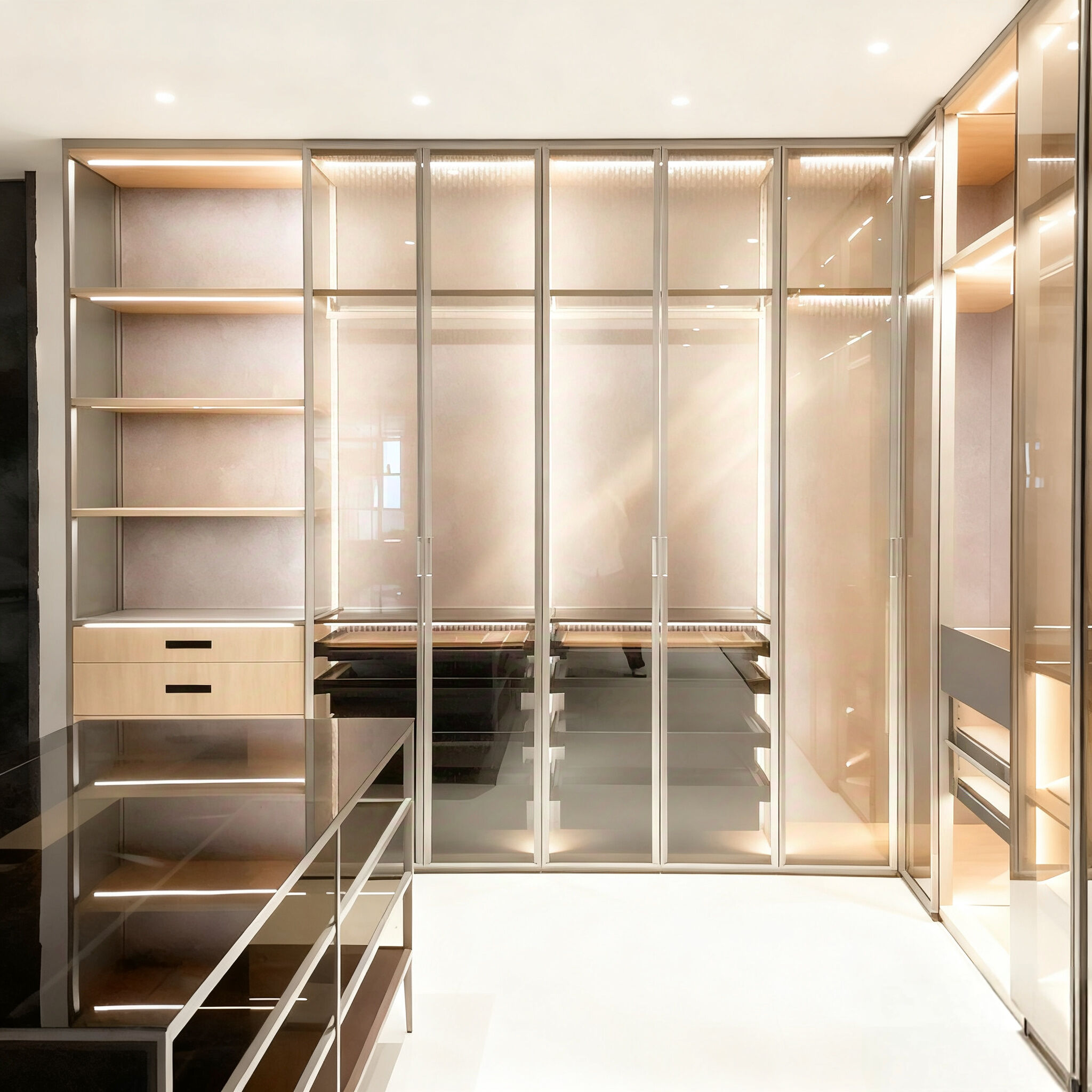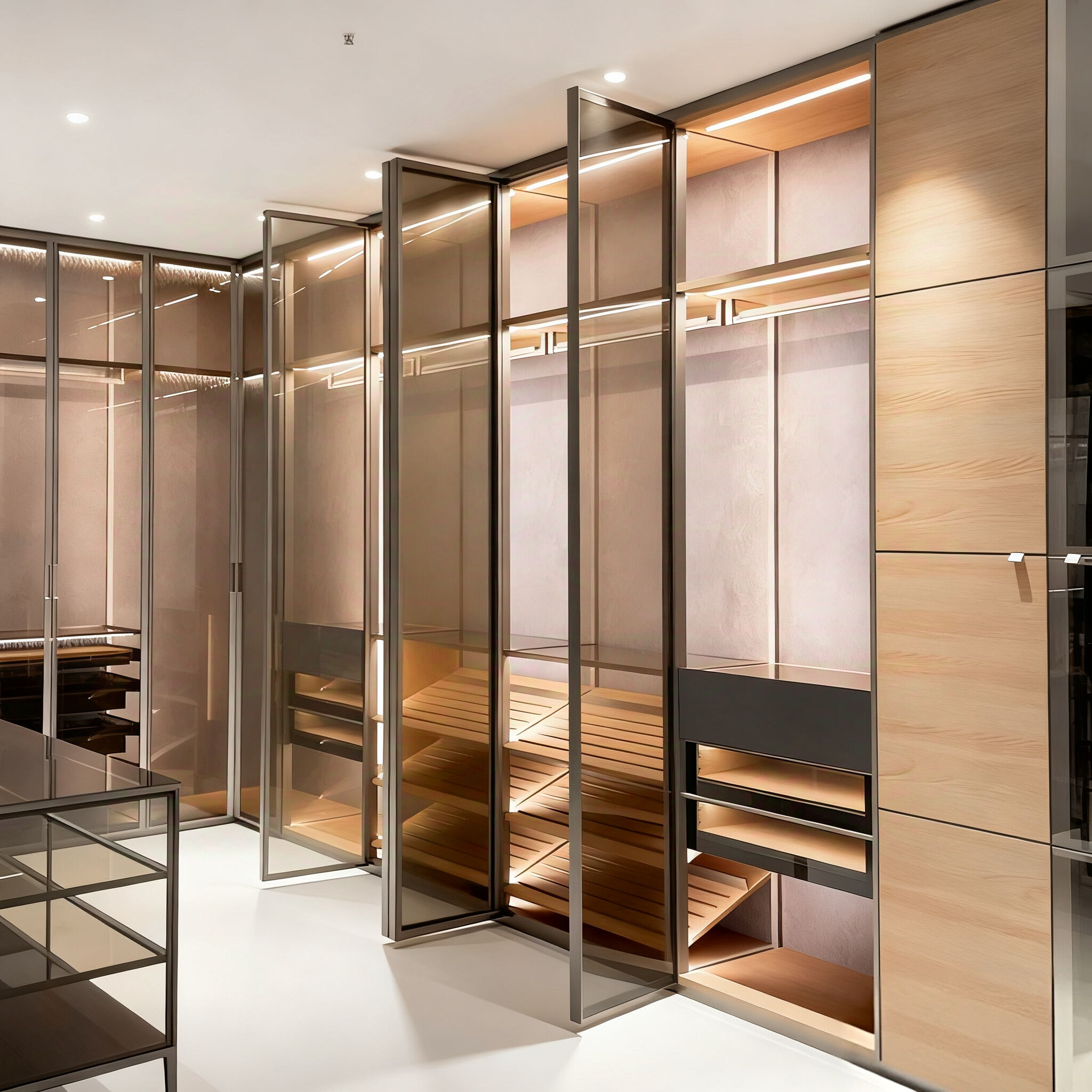 This wardrobe system features a sophisticated combination of metal frameworks, tinted glass panels, and wooden accents. It offers full customization services, including tailored configurations and custom design based on client drawings. The modular structure allows flexible arrangements of hanging rods, open shelves, and closed drawers, meeting diverse storage needs for clothing, accessories, and more. Integrated lighting enhances visibility and elegance, while the sleek design blends seamlessly into high-end bedrooms or dressing areas. It’s a perfect fusion of personalized functionality and modern aesthetic, ideal for clients seeking unique, tailor-made storage solutions.