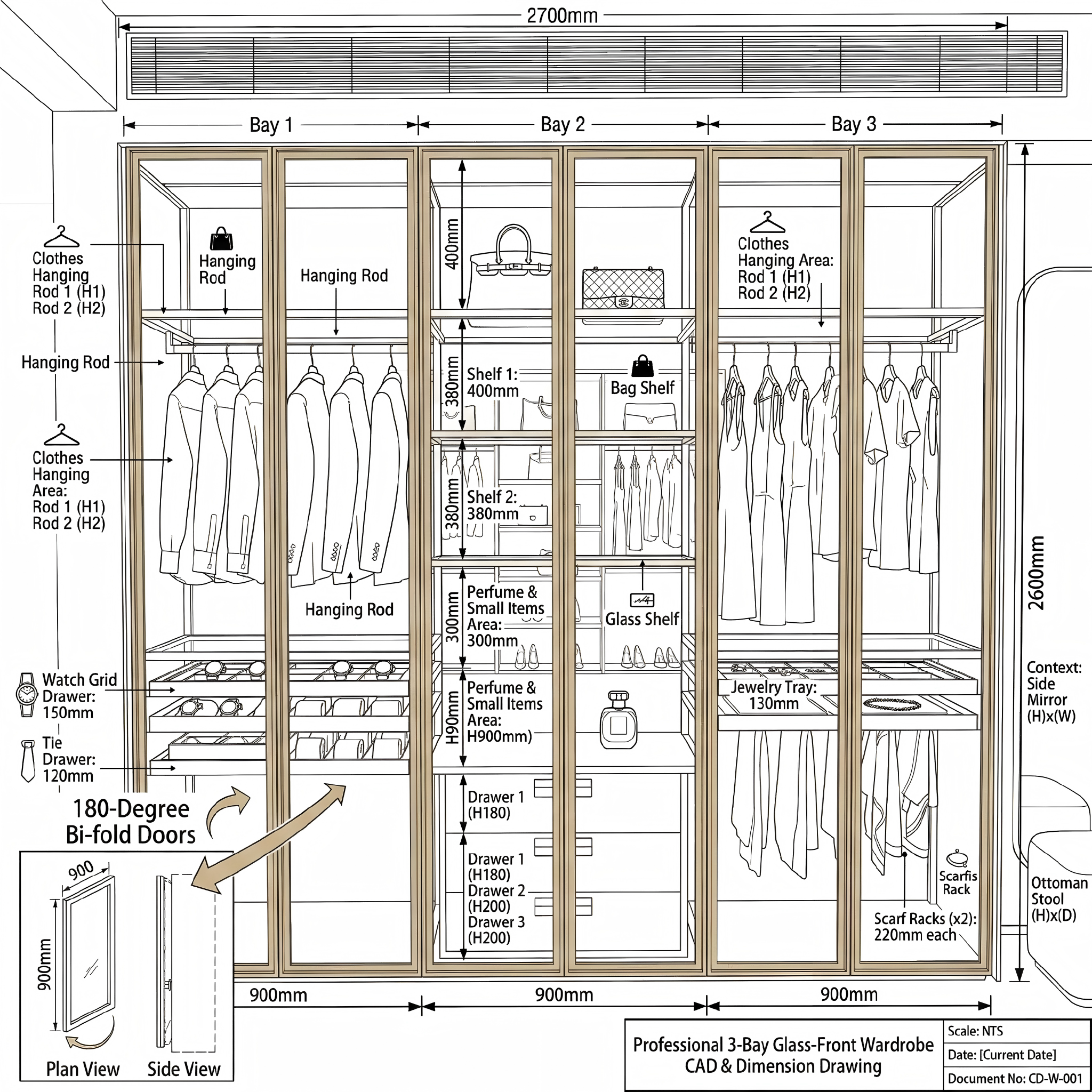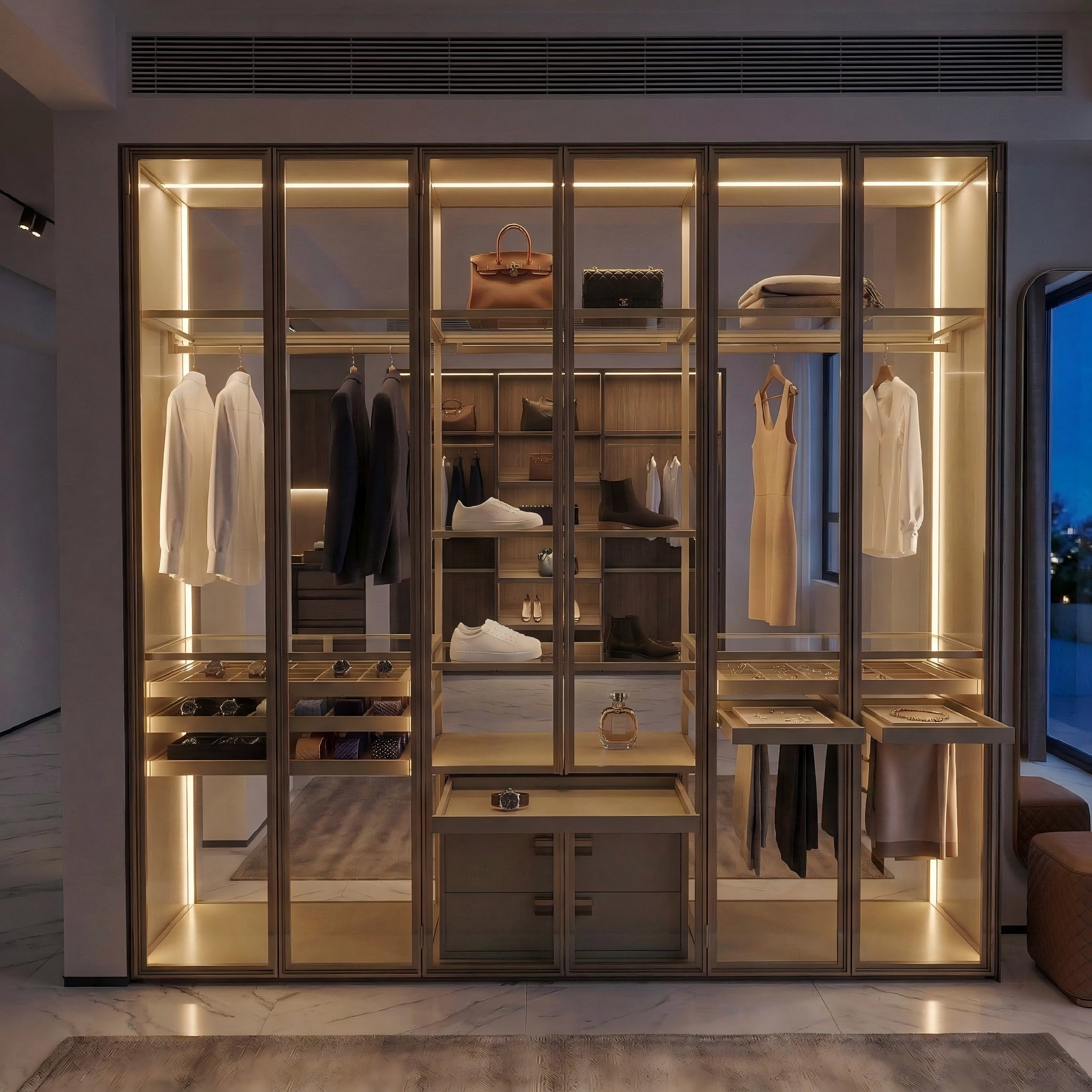 This wardrobe system features a sophisticated combination of metal frameworks, tinted glass panels, and wooden accents. It offers full customization services, including tailored configurations and custom design based on client drawings. The modular structure allows flexible arrangements of hanging rods, open shelves, and closed drawers, meeting diverse storage needs for clothing, accessories, and more. Integrated lighting enhances visibility and elegance, while the sleek design blends seamlessly into high-end bedrooms or dressing areas. It’s a perfect fusion of personalized functionality and modern aesthetic, ideal for clients seeking unique, tailor-made storage solutions.