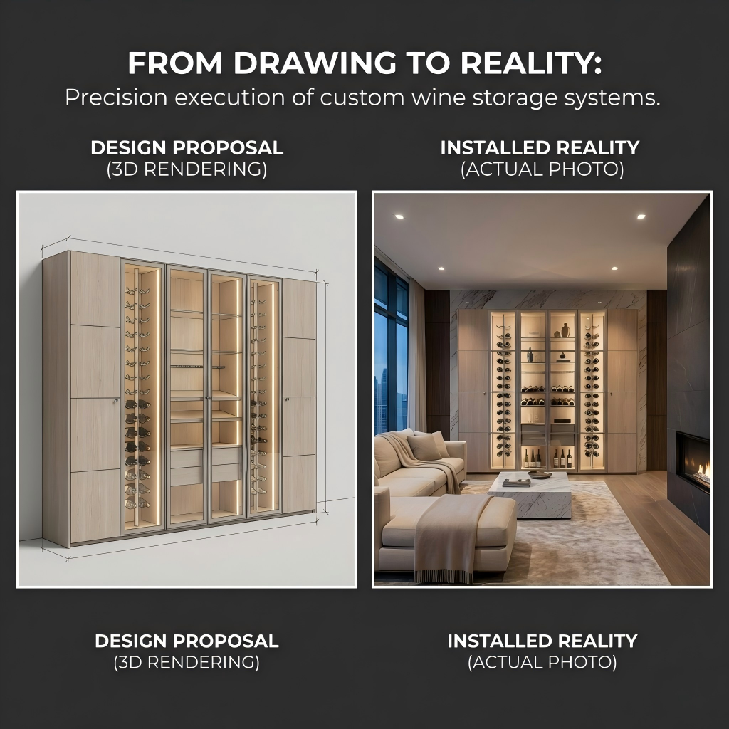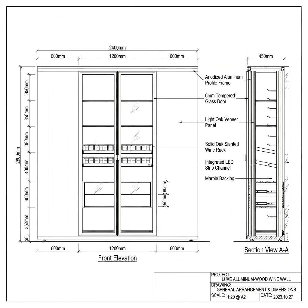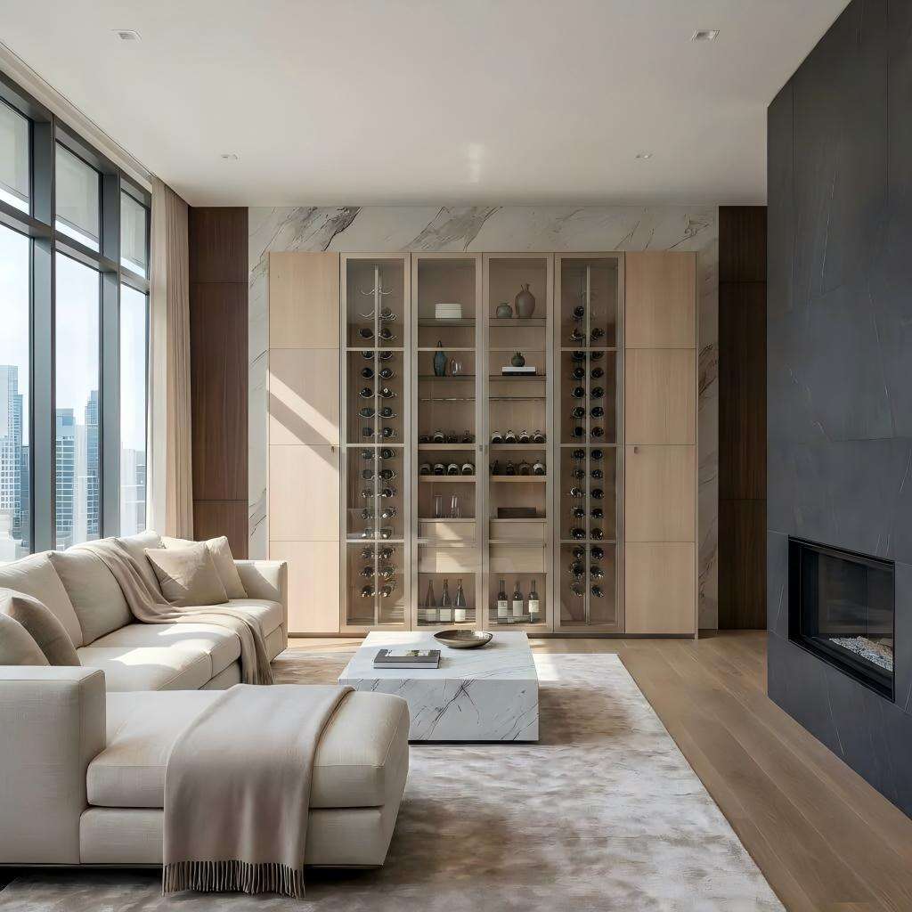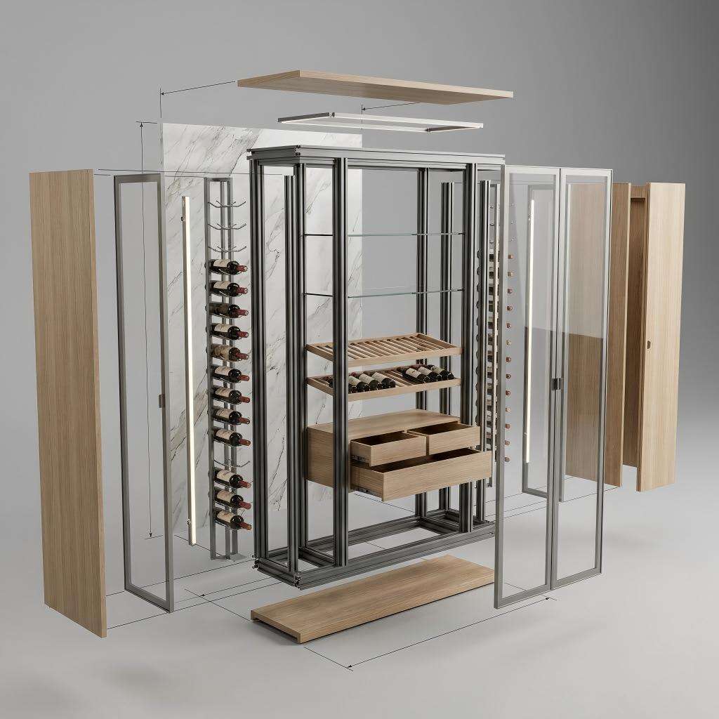 Dette vinkabinettet har en sofistikert design med metallrammer, glasspaneler og treakcenter. Det har en helt skreddersydd modulær struktur som tillater tilpassede konfigurasjoner – fra vinhyller til oppbevaringsenheter – basert på kundens behov. Den flerfunksjonelle interne inndelingen er ideell for å organisere og vise fram vinsamlinger, mens glassdørene gir beskyttelse mot støv og et elegant utstillingselement. Det integreres sømløst i luksusboliger, vinrom eller underholdningsområder og kombinerer funksjonalitet med høykvalitets estetikk.