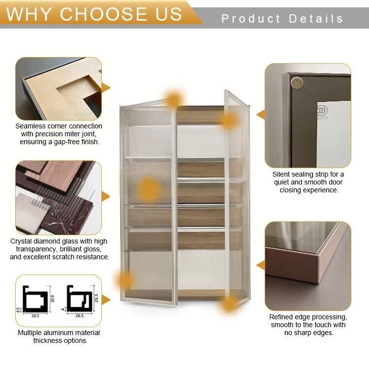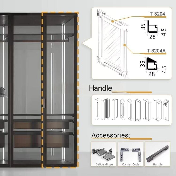 Our premium aluminum frame doors redefine elegance and functionality for your wardrobes, wine cabinets, and more. Crafted with high-quality aluminum profiles (see the precise structural design in our diagrams), these doors offer exceptional durability and a sleek, modern aesthetic that seamlessly blends into any interior style—from minimalist to luxury.