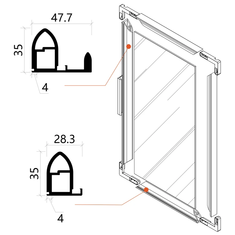 Our premium aluminum frame doors redefine elegance and functionality for your wardrobes, wine cabinets, and more. Crafted with high-quality aluminum profiles (see the precise structural design in our diagrams), these doors offer exceptional durability and a sleek, modern aesthetic that seamlessly blends into any interior style—from minimalist to luxury.