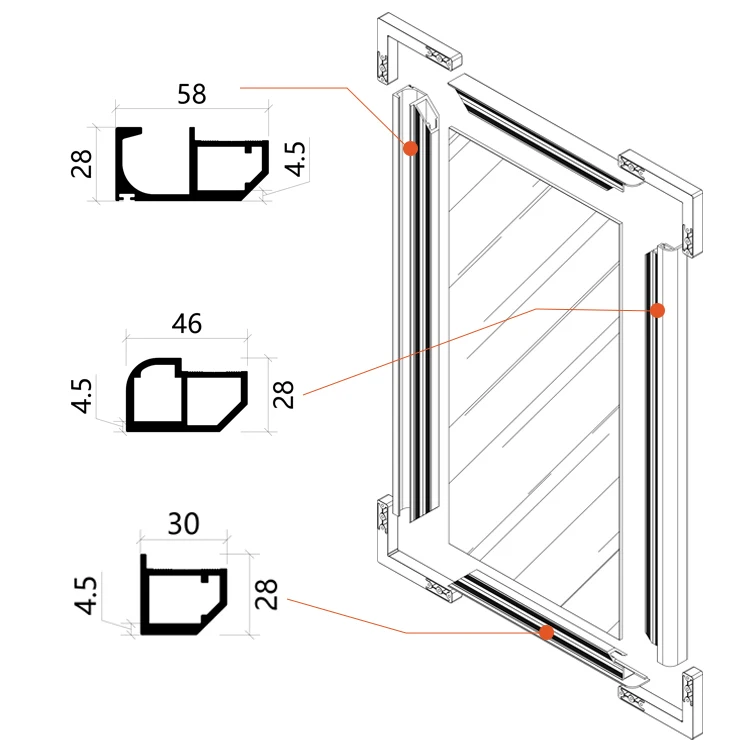 Our premium aluminum frame doors redefine elegance and functionality for your wardrobes, wine cabinets, and more. Crafted with high-quality aluminum profiles (see the precise structural design in our diagrams), these doors offer exceptional durability and a sleek, modern aesthetic that seamlessly blends into any interior style—from minimalist to luxury.