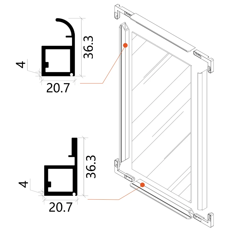 Our premium aluminum frame doors redefine elegance and functionality for your wardrobes, wine cabinets, and more. Crafted with high-quality aluminum profiles (see the precise structural design in our diagrams), these doors offer exceptional durability and a sleek, modern aesthetic that seamlessly blends into any interior style—from minimalist to luxury.