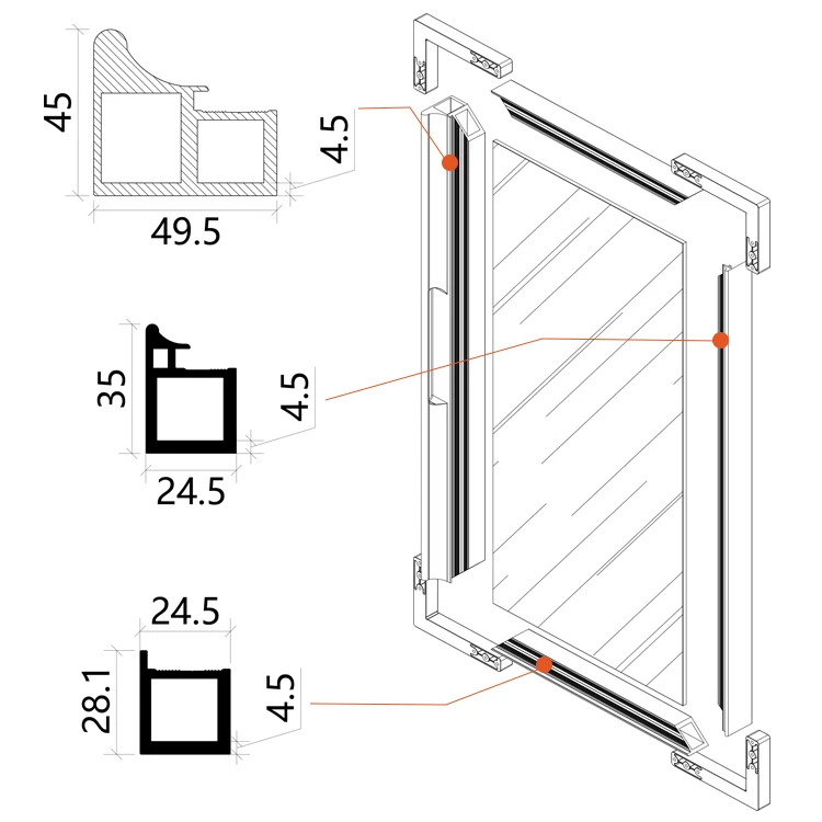 Our premium aluminum frame doors redefine elegance and functionality for your wardrobes, wine cabinets, and more. Crafted with high-quality aluminum profiles (see the precise structural design in our diagrams), these doors offer exceptional durability and a sleek, modern aesthetic that seamlessly blends into any interior style—from minimalist to luxury.