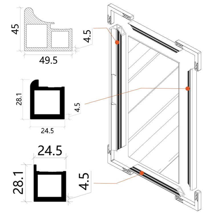 Our premium aluminum frame doors redefine elegance and functionality for your wardrobes, wine cabinets, and more. Crafted with high-quality aluminum profiles (see the precise structural design in our diagrams), these doors offer exceptional durability and a sleek, modern aesthetic that seamlessly blends into any interior style—from minimalist to luxury.